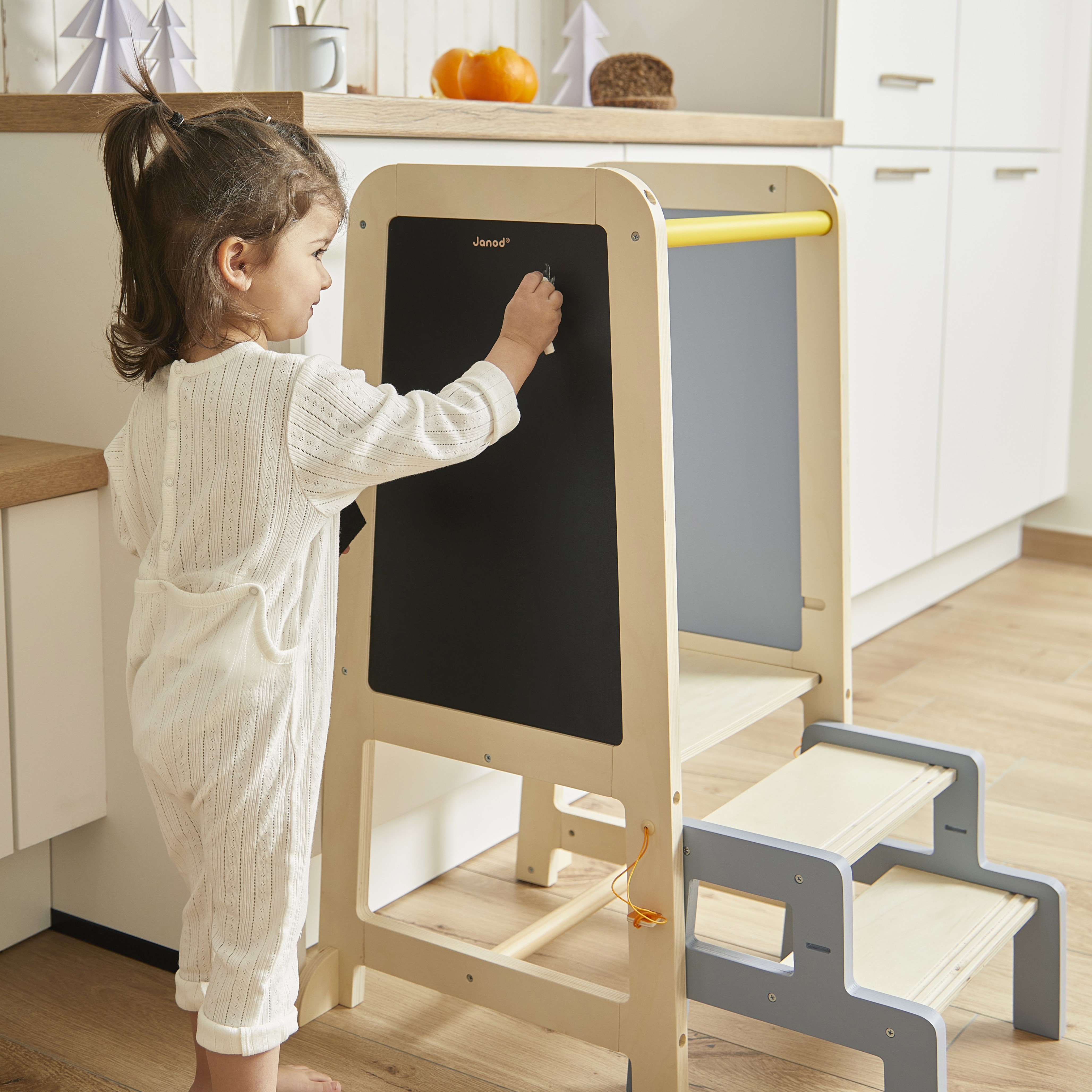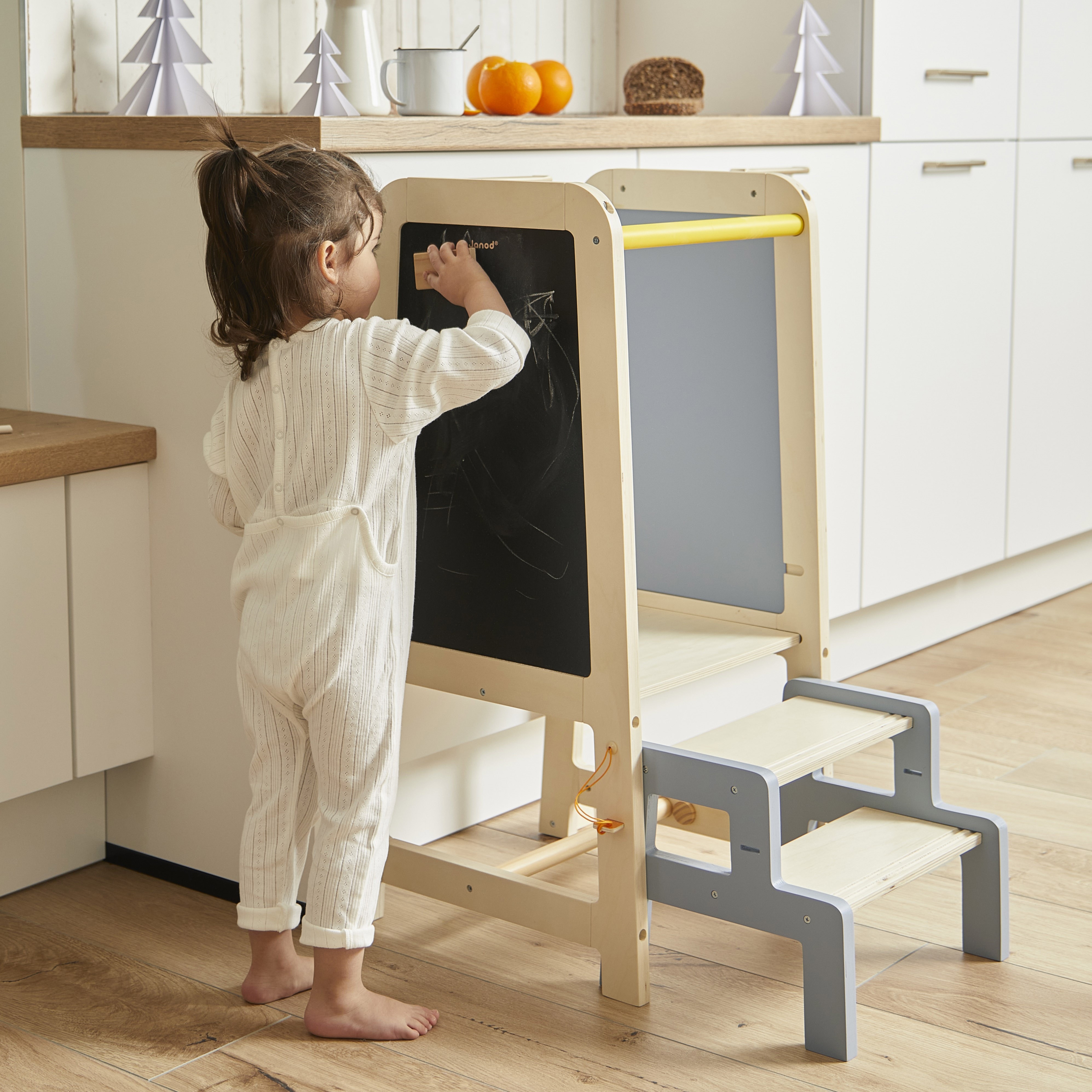 A la découverte du monde des grands !! Cette jolie tour d’observation en bois va permettre à votre enfant de se hisser à votre hauteur pour toutes les activités du quotidien : à la cuisine, devant le lavabo… et lui permettre de développer plus facilement sa motricité fine, son autonomie et son interaction avec les autres. La tour grandit avec votre enfant grâce à 2 niveaux permettant l’ajustement de la hauteur (de 32,5 à 40,5 cm). Elle est aussi très accessible grâce à son tabouret amovible qui sert de marchepied. Il peut se fixer à la tour pour plus de sécurité, grâce à deux clés, et se détacher facilement pour être transporté dans toute la maison. Au-delà de son côté pratique, la tour a aussi un côté ludique grâce au tableau noir situé sur le côté qui propose une grande jouabilité, pour dessiner ou écrire de nouvelles recette ! Livrée avec une 2 craies et une brosse. Pour les enfants à partir de 18 mois.