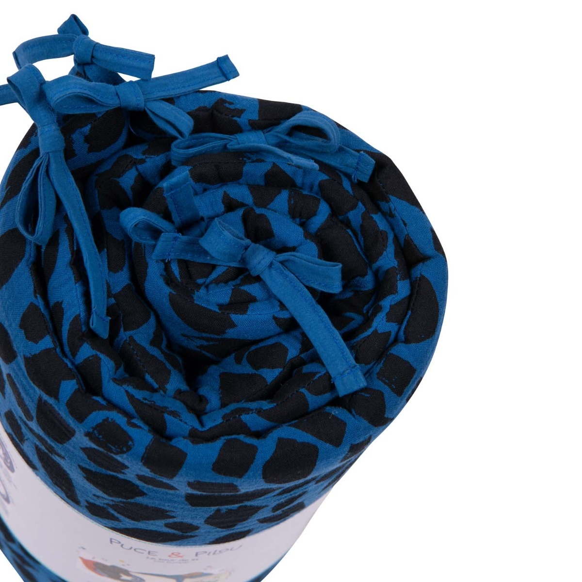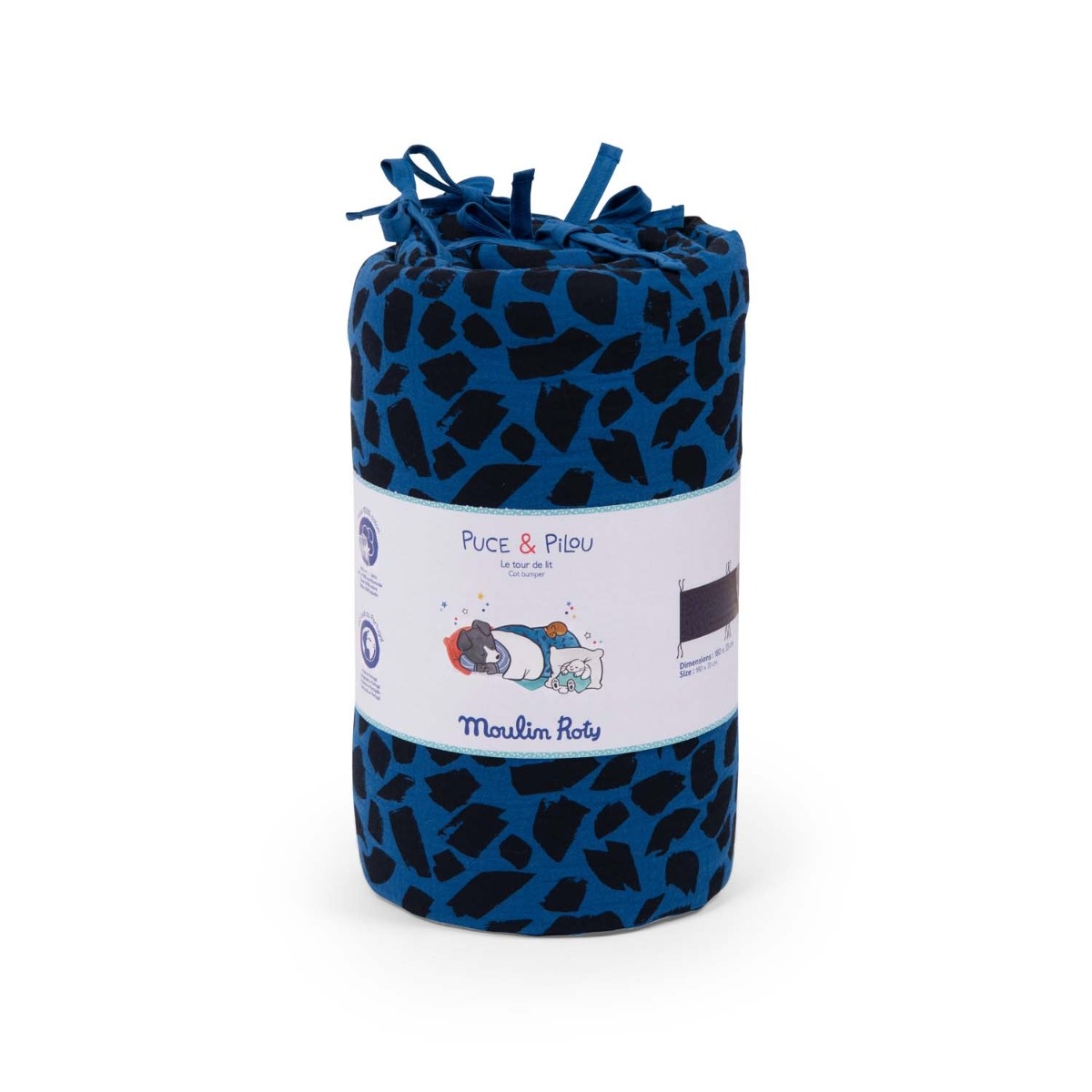 Le tour de lit bébé bleu de la collection Puce & Pilou de Moulin Roty, avec ses dimensions de 180x33cm, offre une double épaisseur de lange 100% coton pour un maximum de douceur. Son motif tacheté habille le lit de bébé tout en décorant sa chambre dans l'esprit de la collection.