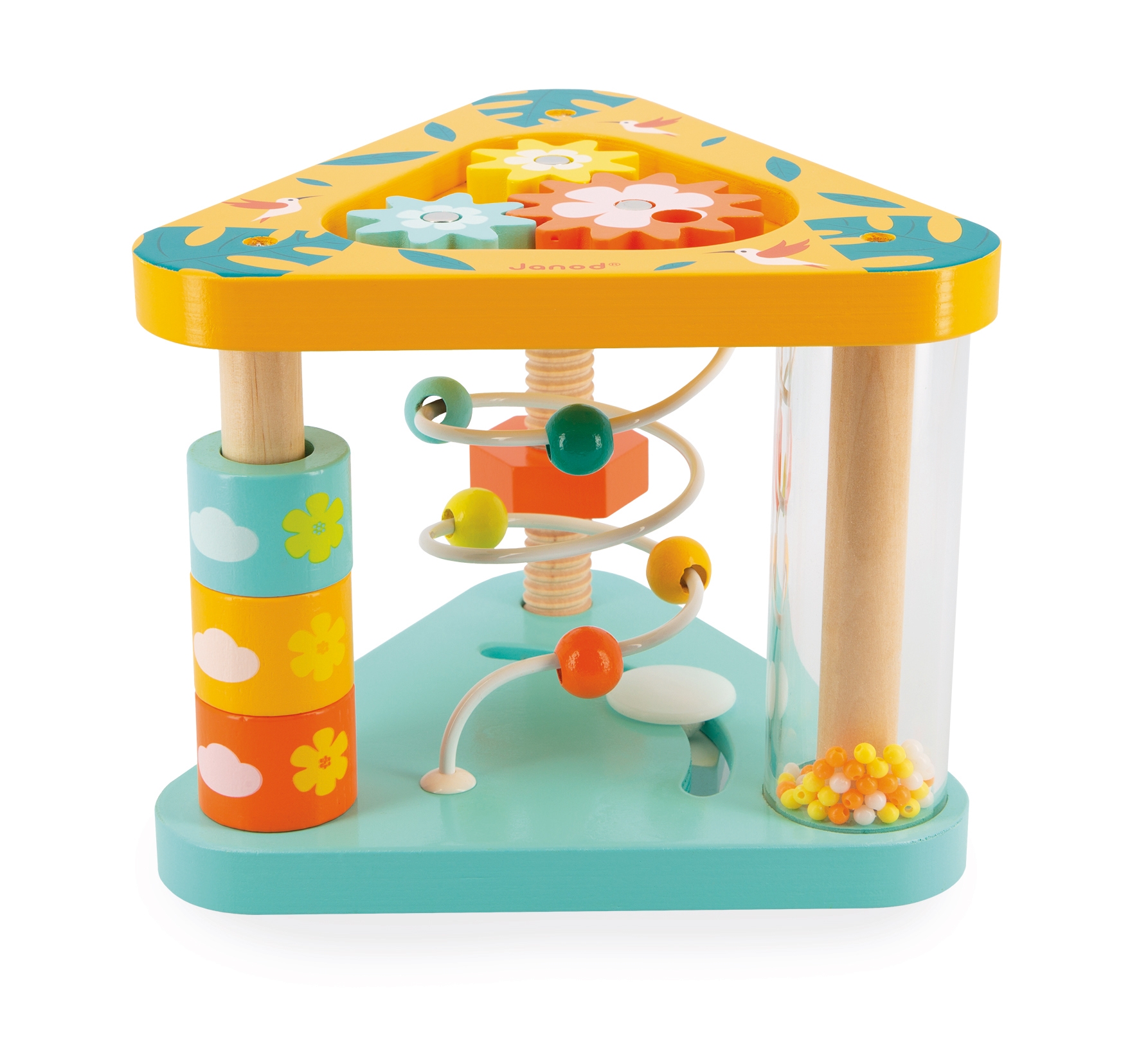 Ce triangle d'activités aux couleurs multivitaminées vous fera voyager sous les tropiques ! Avec ses 7 activités réparties sur ses 2 faces : labyrinthe, miroir, engrenages à tourner, écrous à visser, boulier, bâton de pluie, cylindres à aligner, ce triangle accompagnera votre enfant dans ses premiers apprentissages. Ce triangle stimule l'ouïe, la concentration et la motricité fine. Jouet en bois FSCTM et peinture à l'eau. Jouet d'éveil pour les enfants à partir de 12 mois.