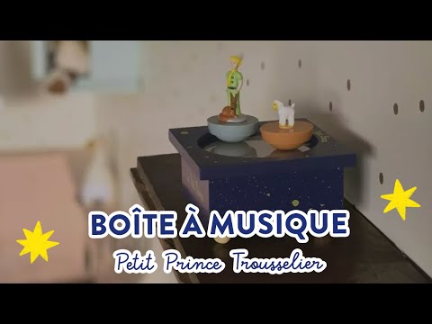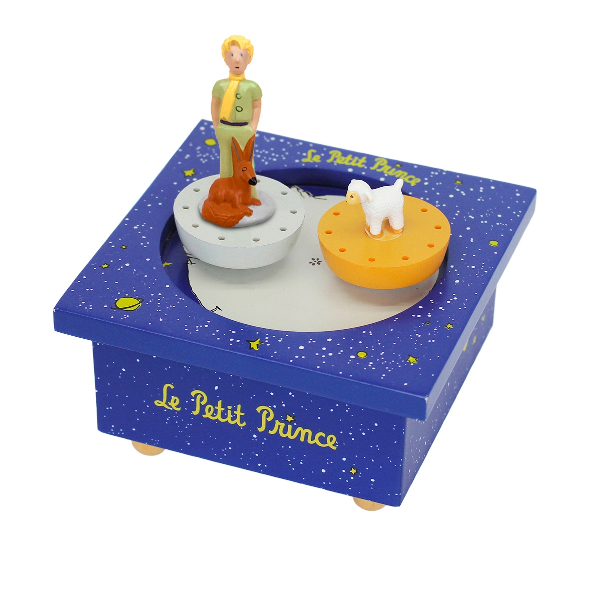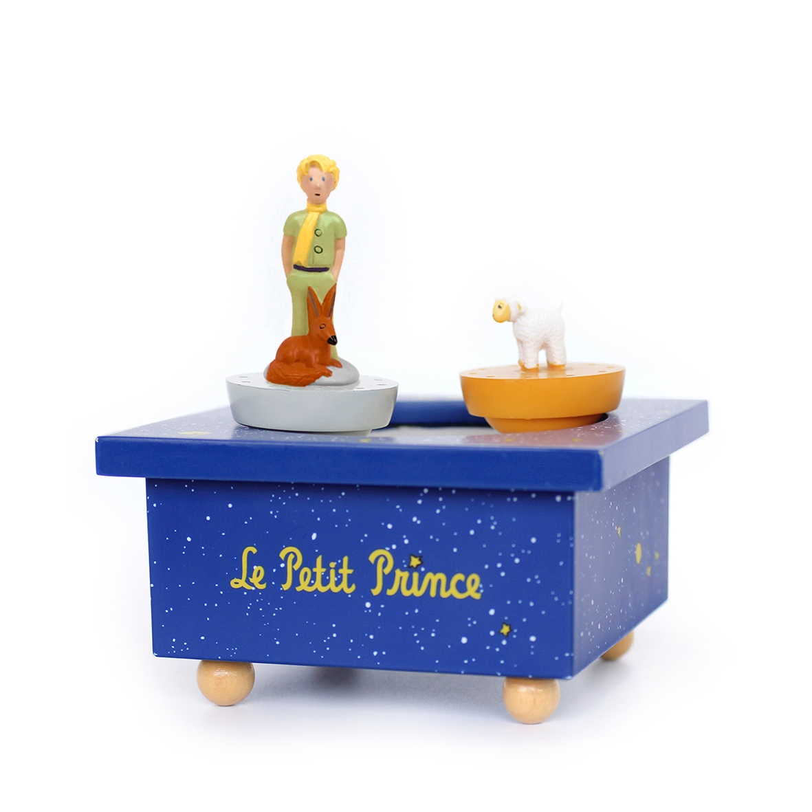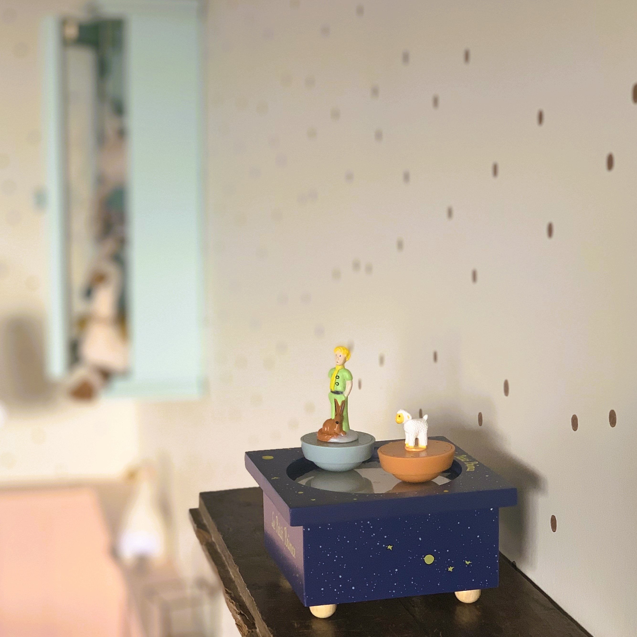 Cette boîte à musique Petit Prince fonctionne de manière mécanique grâce à un principe d'aimants qui anime le Petit Prince et son mouton. Elle diffuse une musique qui apaisera votre enfant et décorera sa chambre. Nouveau . Il est désormais possible de personnaliser ce produit à l'aide d'un sticker au prénom de l'enfant . Appliqué lettre par lettre et à la main par nos soins, ce sticker fera le plus bel effet auprès de l'enfant et des parents tout en rendant ce cadeau unique. Ses . En bois et plastique, figurines en résine.