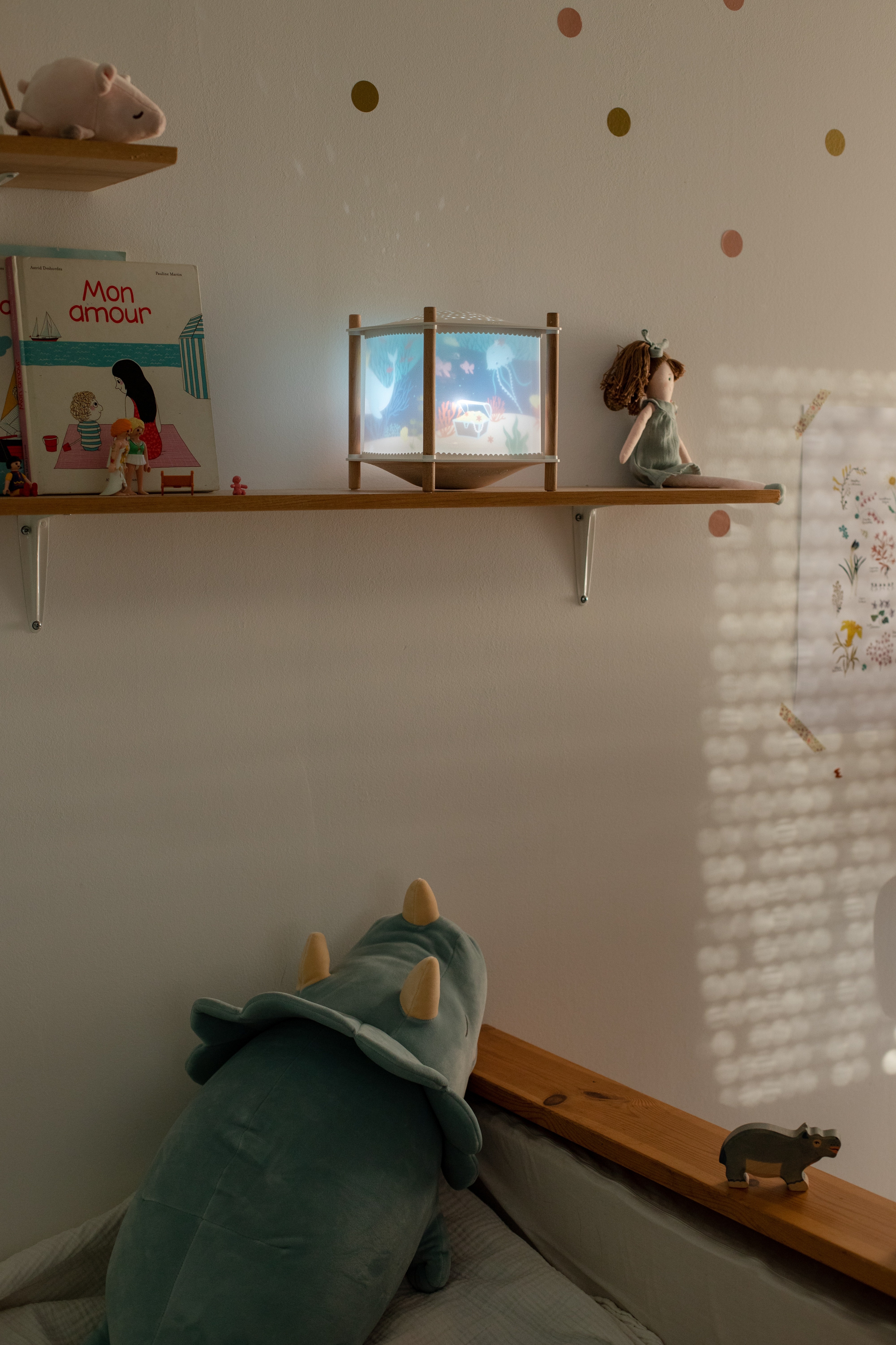 Cette lanterne Trousselier 4 en 1 est une alliée idéale pour bébé mais aussi pour les parents. Grâce à ses multiples fonctionnalités, cette jolie veilleuse illustrée d'une baleine, d'une méduse et de poissons, accompagnera avec tendresse votre petit au moment du coucher. Avec sa lumière douce et légère, bébé sera ainsi émerveillé devant les animaux qui s'animent pour lui raconter une histoire. Pratique car sans fil, cette lanterne transforme également le plafond de la chambre en voûte céleste grâce à sa fonction "Projecteur d'étoiles". Comme une nuit à la belle étoile, votre enfant se sentira apaisé et enchanté par ce joli spectacle. La fonction musicale permet de diffuser des berceuses à votre bout de chou : 4 berceuses sont préenregistrées mais il possible grâce au Bluetooth de diffuser une histoire ou la musique de votre choix depuis votre smartphone ou tablette. Enfin, cette veilleuse est également un détecteur de pleurs . Grâce à cette fonction, la lanterne se rallume automatiquement pour rassurer bébé lorsqu'il se met à pleurer. Véritable lampe multifonction, cette lanterne est un très bel objet de décoration de chambre, à poser sur une commode ou un chevet. Celle-ci se recharge par câble USB (fourni) et dispose d'une autonomie d'environ une semaine pour une utilisation de 30 minutes par jour. Associant tradition et modernité, cette lanterne RêVOLUTION 2. 0 est un cadeau original pour une naissance. Matière(s) : plastique et bois. Dès 36 mois.