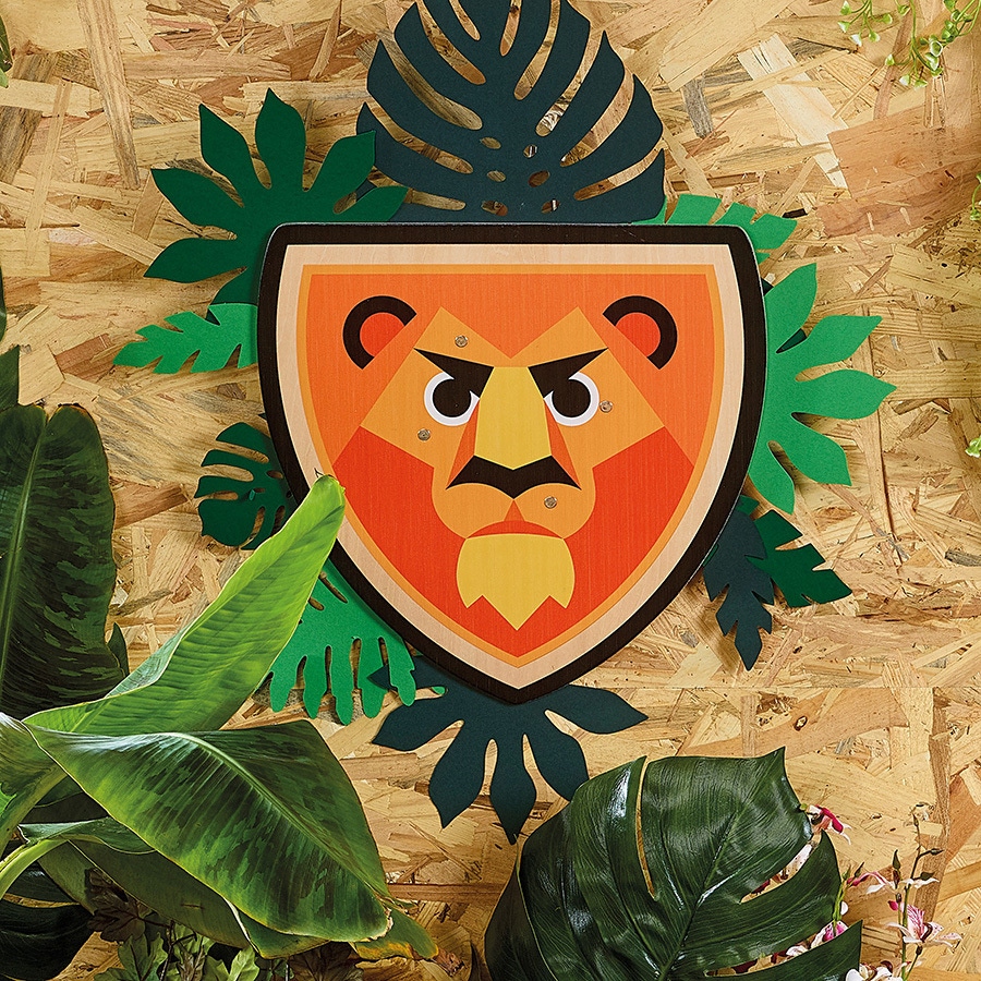 Un bouclier et une épée en bois pour les apprentis chevaliers. Je suis le Roi des animaux . Bouclier largeur 34 cm - hauteur 35 cm. Dès 4 ans.