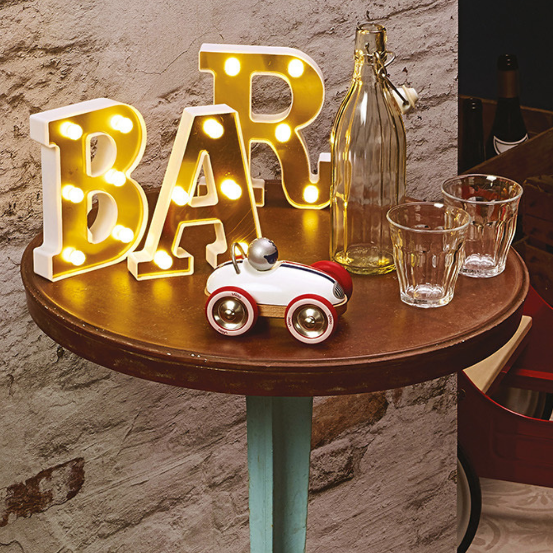 Voiture roadster en bois massif. Coloris blanc. Roues en métal et caoutchouc. 100% Made In France. A partir de 2 ans.